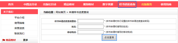 3.樣書申請(qǐng)進(jìn)度查詢 點(diǎn)擊導(dǎo)航欄下的樣書進(jìn)度查詢,輸入樣書申請(qǐng)時(shí)填寫的樣書申請(qǐng)進(jìn)度查詢密碼、姓名以及移動(dòng)電話,可以查詢樣書申請(qǐng)出版社審核情況等。